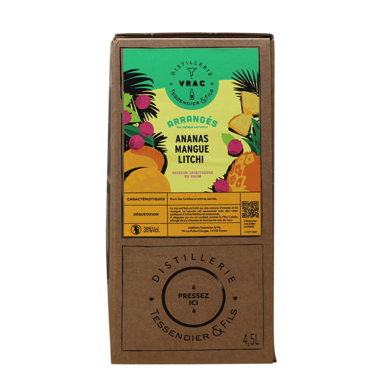 Découvrez l'arrangé Ananas Mangue Litchi de la maison Tessendier ! Plus économique et écologique qu'une bouteille, il sera le parfait allié pour réaliser vos meilleurs cocktails !